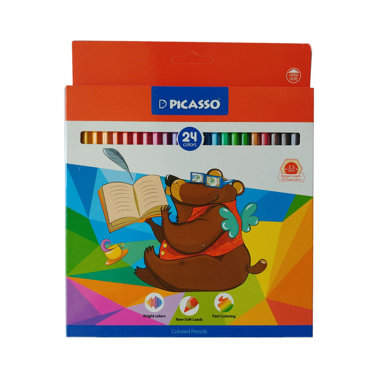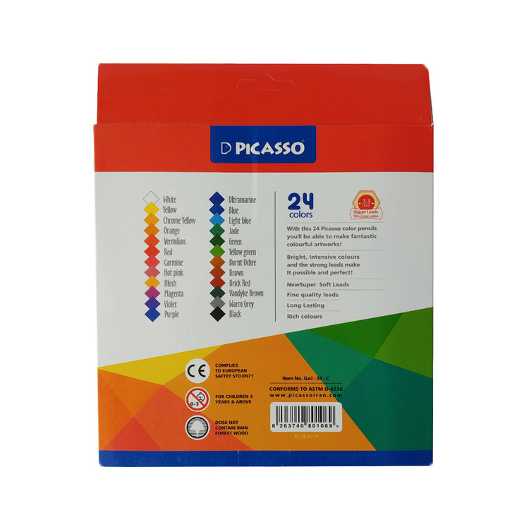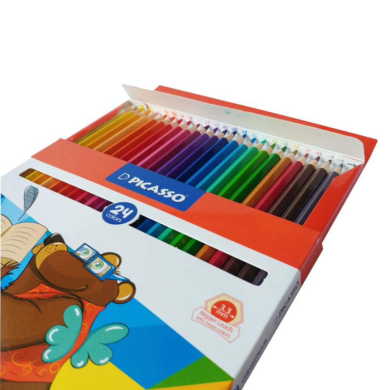 مداد رنگی 24 رنگ جعبه مقوایی پیکاسو (طرح جدید) را می توان یکی از با کیفیت ترین مداد رنگی ها نسبت به رقبا دانست. چرا که هم از کیفیت چوب بالایی برخوردار است و هم گرافیت استفاده شده در مغز مداد، در 24 رنگ مختلف بسیار مرغوب است. نرم بودن مغزی مداد رنگی، تراشیده شدن به راحتی و شکسته نشدن در حین فرآیند تراشیده شدن و همچنین رنگ های جذاب و درخشان، از ویژگی های مداد رنگی های پیکاسو می باشد. طیف رنگی هر جعبه از این مداد رنگی، گستردگی بالایی (در رنگ های گرم و سرد) دارد و برای نقاشان نیمه حرفه ای و افرادی که به نقاشی، به عنوان یک حرفه هنری نگاه دارند، گزینه ی بسیار مناسبی است.