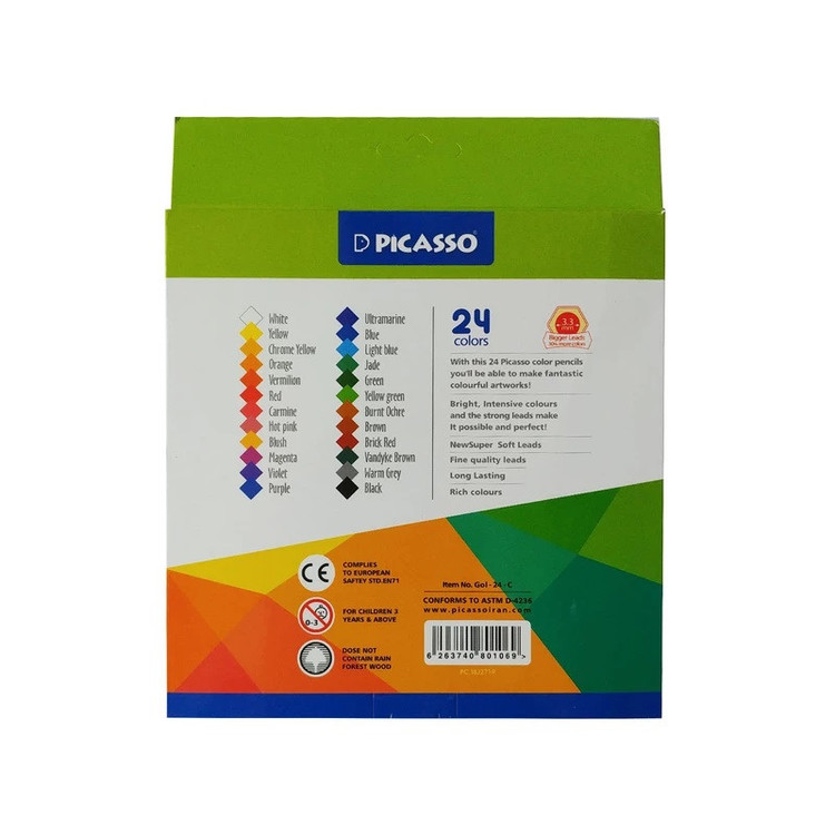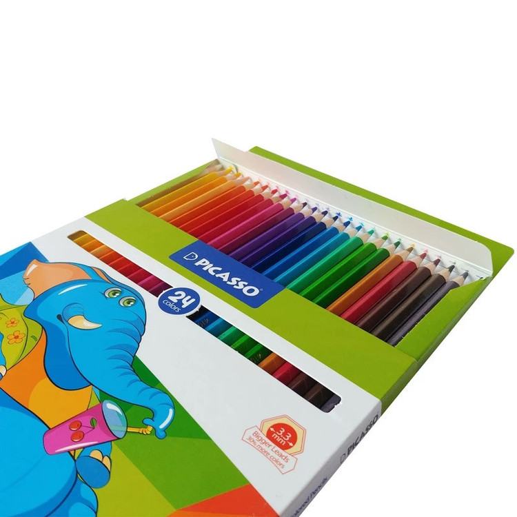 مداد رنگی 24 رنگ جعبه مقوایی پیکاسو (طرح جدید) را می توان یکی از با کیفیت ترین مداد رنگی ها نسبت به رقبا دانست. چرا که هم از کیفیت چوب بالایی برخوردار است و هم گرافیت استفاده شده در مغز مداد، در 24 رنگ مختلف بسیار مرغوب است. نرم بودن مغزی مداد رنگی، تراشیده شدن به راحتی و شکسته نشدن در حین فرآیند تراشیده شدن و همچنین رنگ های جذاب و درخشان، از ویژگی های مداد رنگی های پیکاسو می باشد. طیف رنگی هر جعبه از این مداد رنگی، گستردگی بالایی (در رنگ های گرم و سرد) دارد و برای نقاشان نیمه حرفه ای و افرادی که به نقاشی، به عنوان یک حرفه هنری نگاه دارند، گزینه ی بسیار مناسبی است.